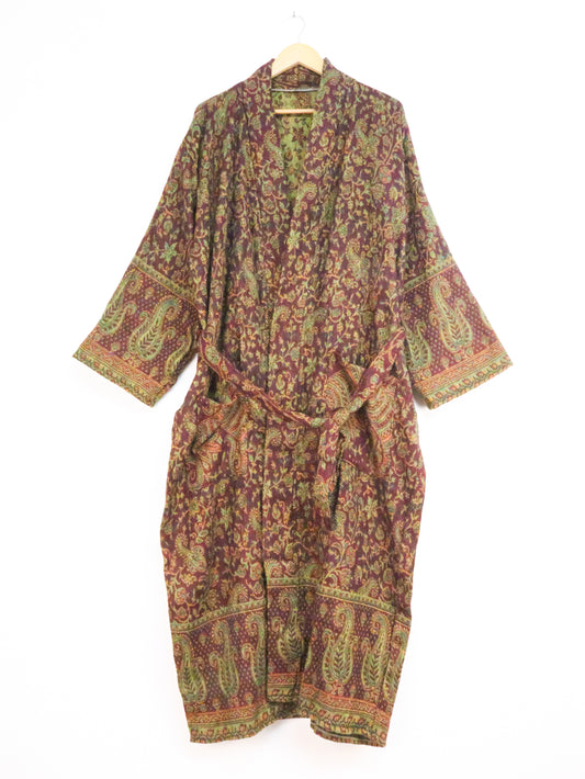 Blanket Kimono Robe Boho Dressing Gown - Burgundy Green and Gold