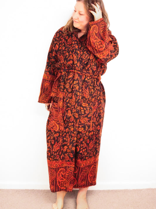 Blanket Kimono Robe Boho Dressing Gown - Burgundy Green and Gold