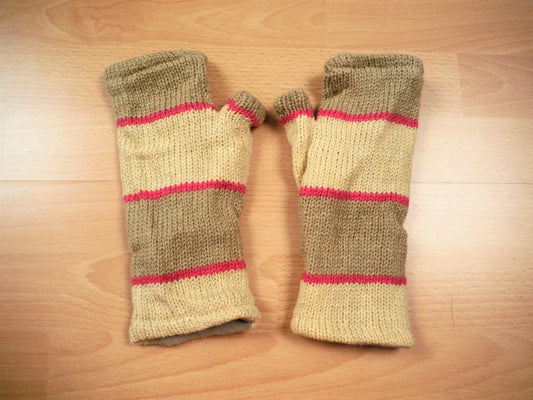 Fleece Lined Knitted Wrist Warmers - Cream and Pink Striped (Loose Fit)