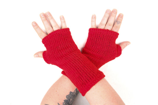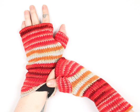 Fleece Lined Knitted Wrist Warmers - Red Orange and Cream Striped