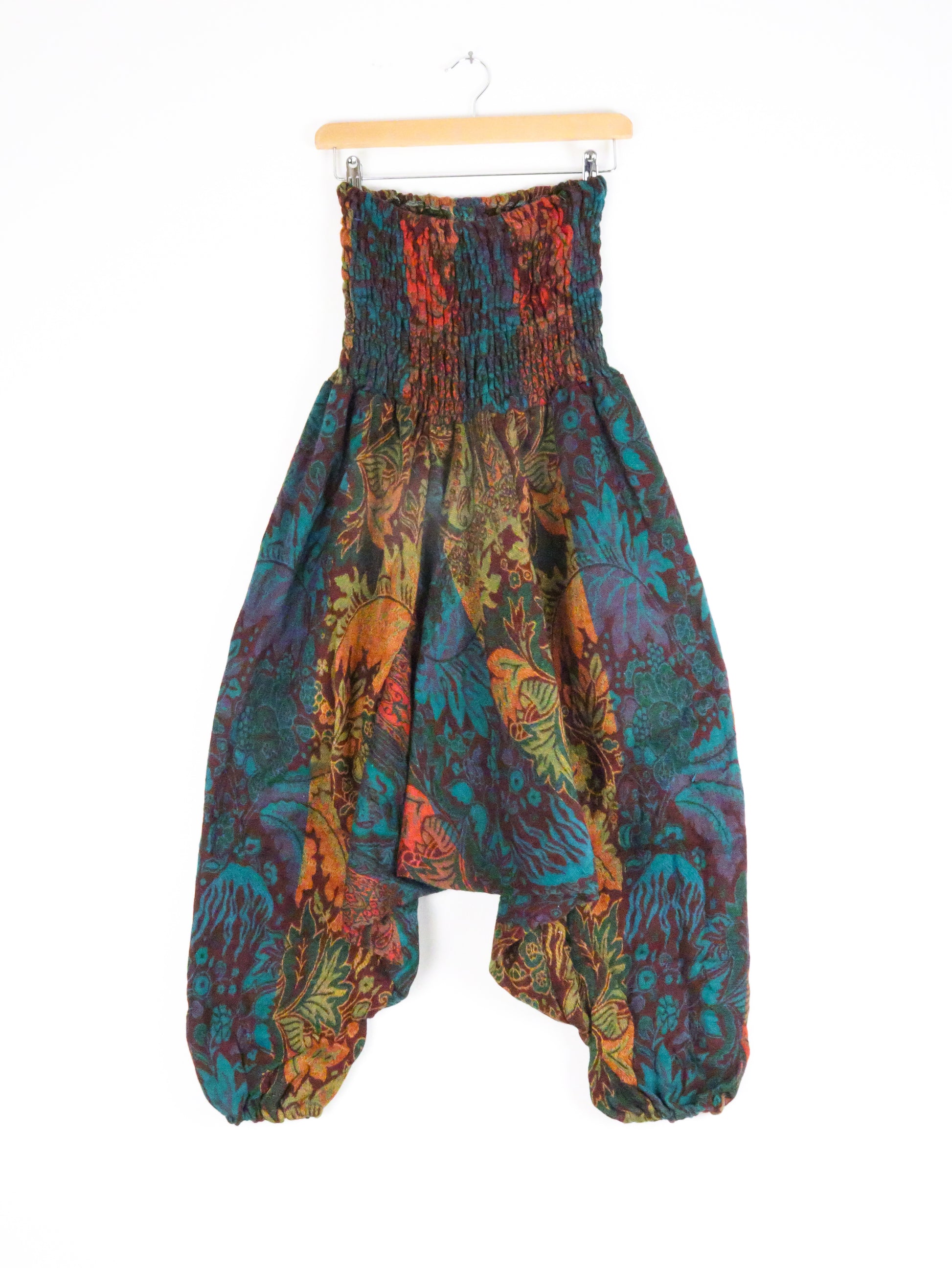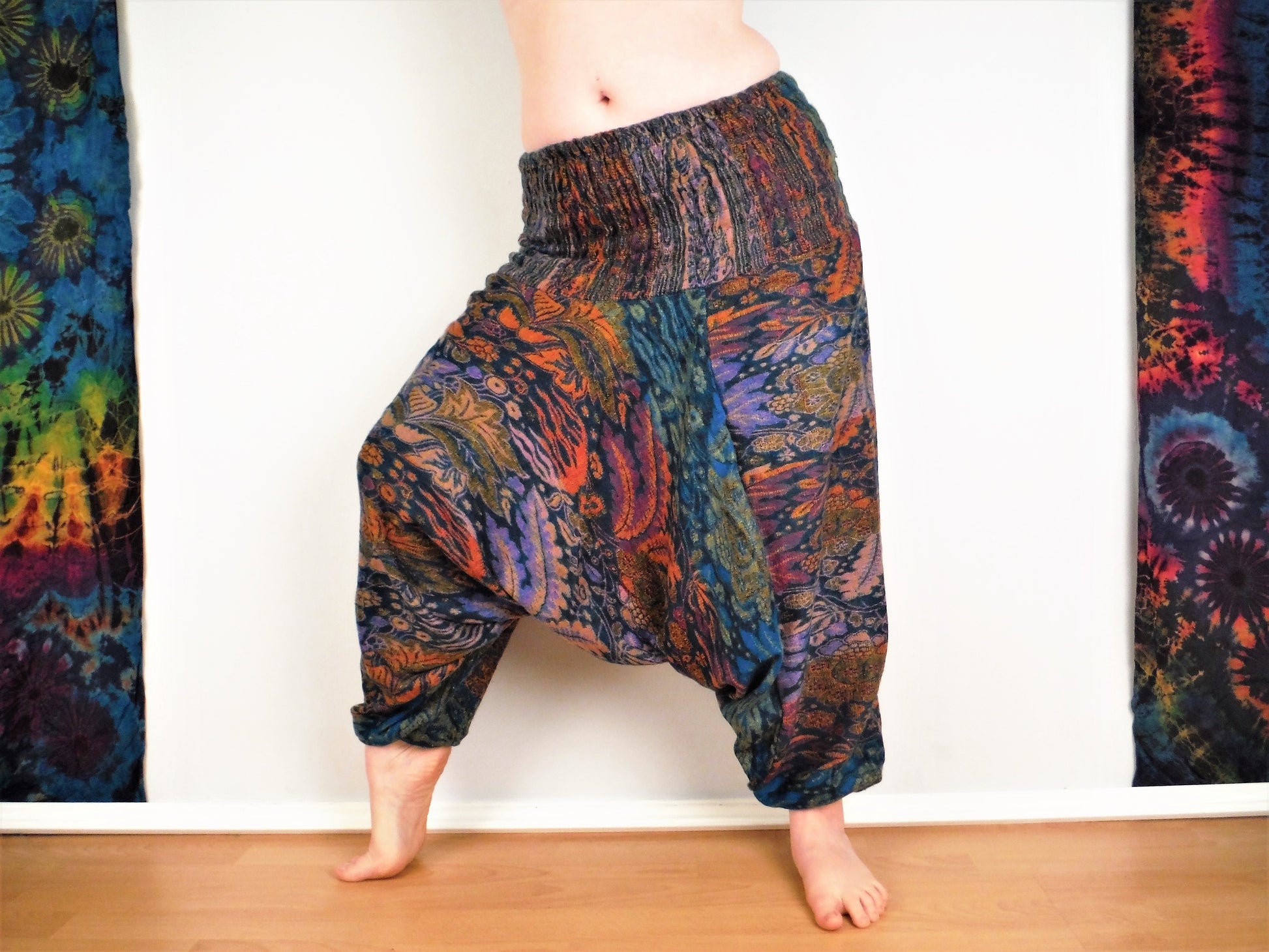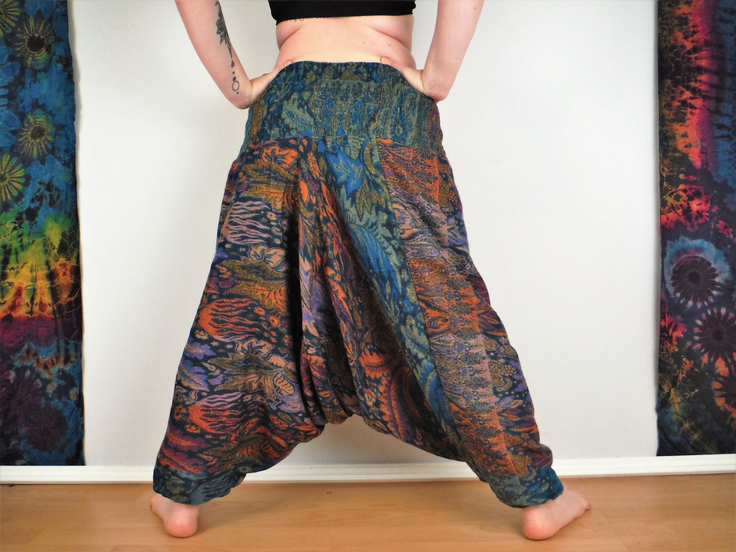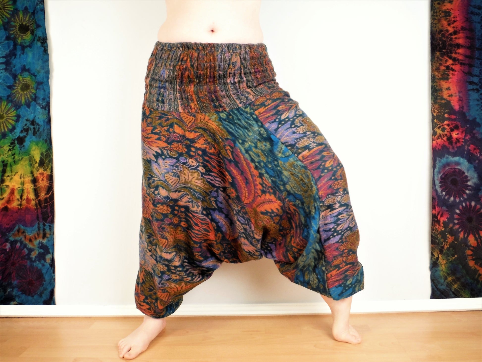The comfiest trousers you will ever own! These harems are unisex and have a large soft elasticated top panel to fit from small/teenage sizes up to a 44inch waist.