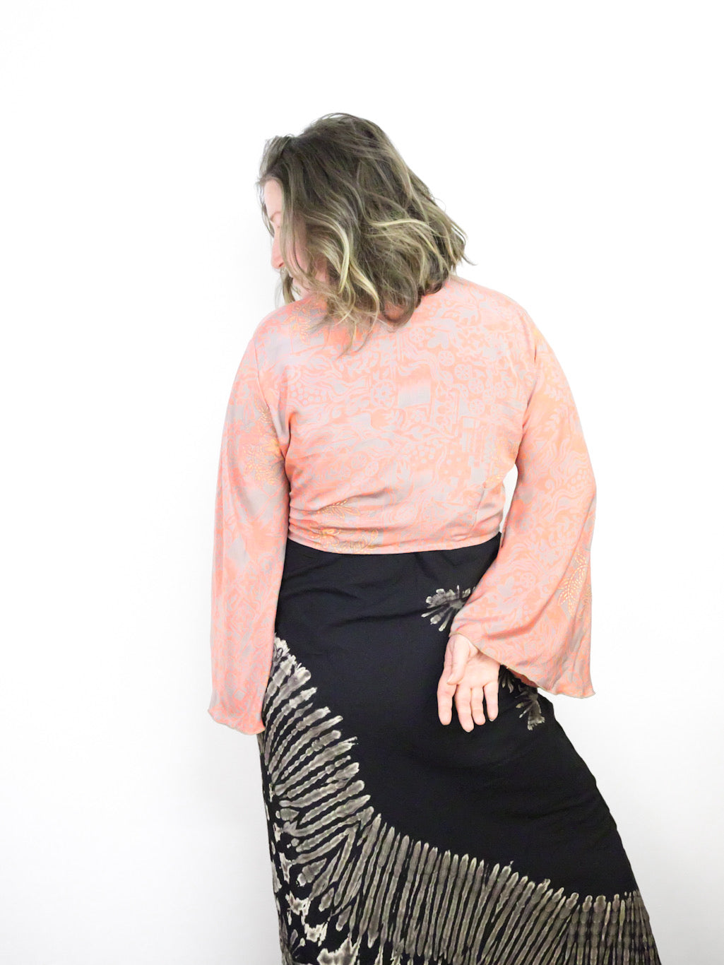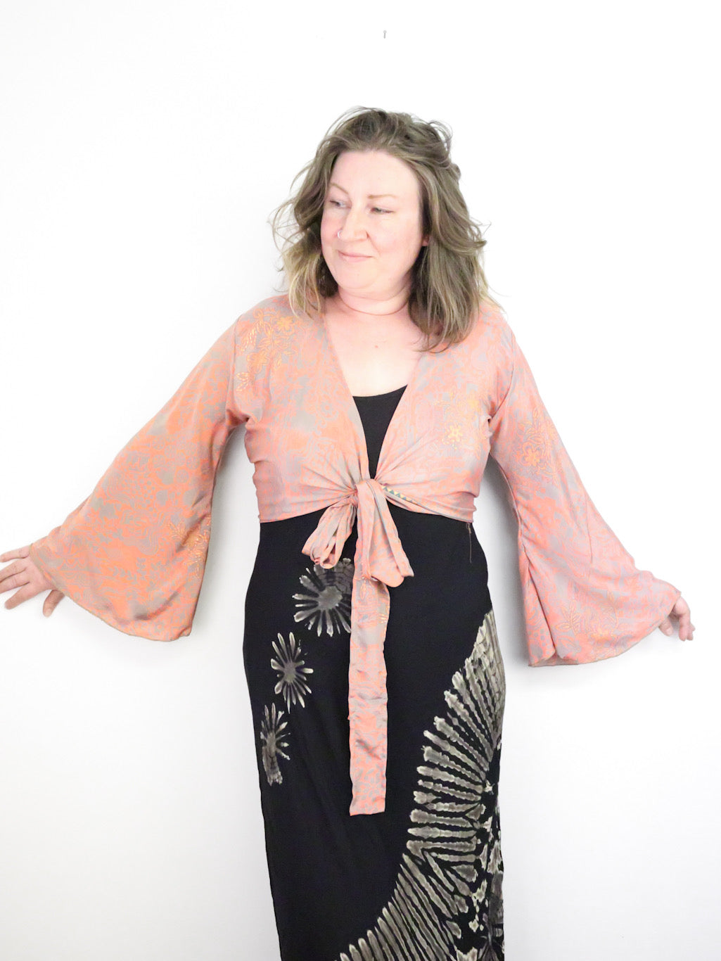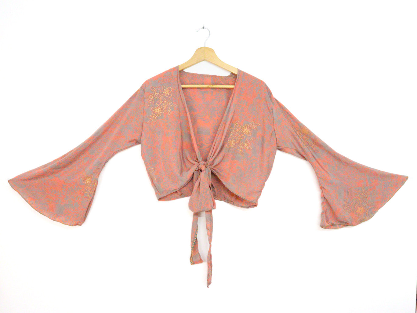 Made from 70% silk, this Recycled Sari Cropped Kimono Cardigan Wrap is both stylish and sustainable. With its adjustable size, front tie, and flowing bell sleeves, it's the perfect boho addition to any summer outfit. Plus, it's an eco-friendly choice, making it a cool extra lightweight layer for those hot summer days.