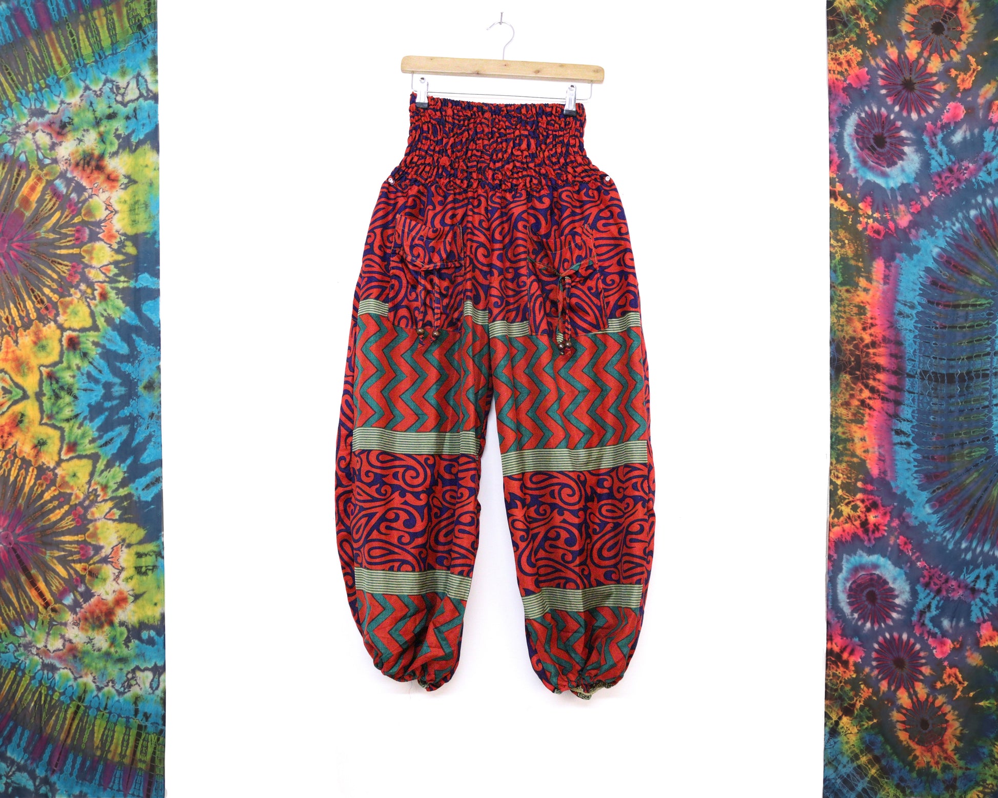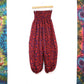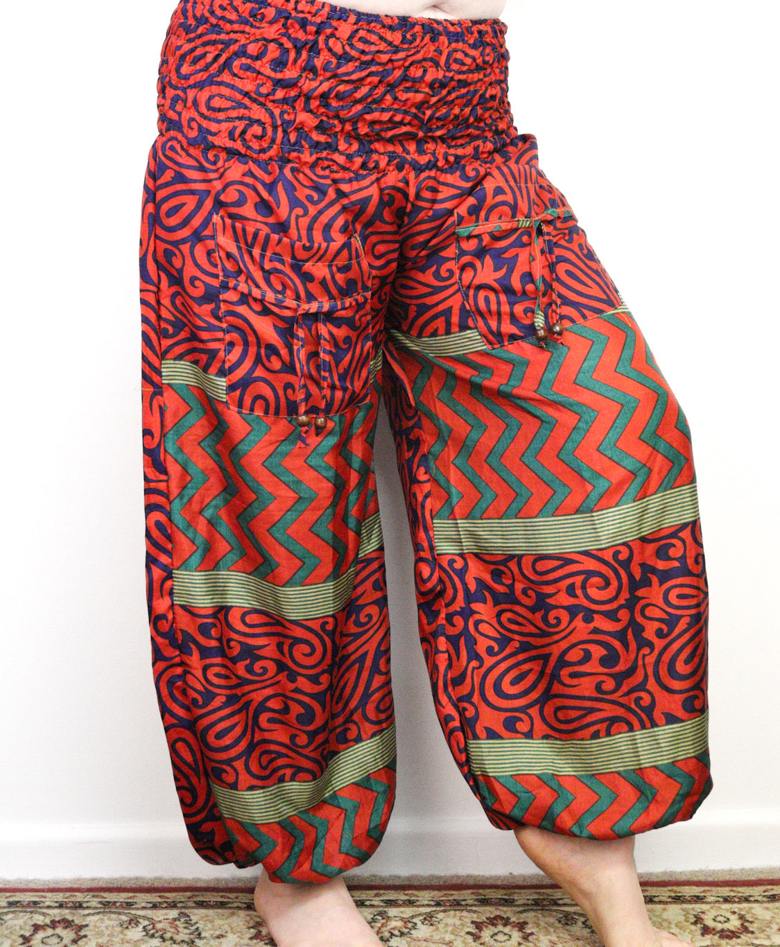 These recycled sari fabric trousers are unisex and elasticated around a wide band at the top making them incredibly comfortable (even on pregnant bellies!).