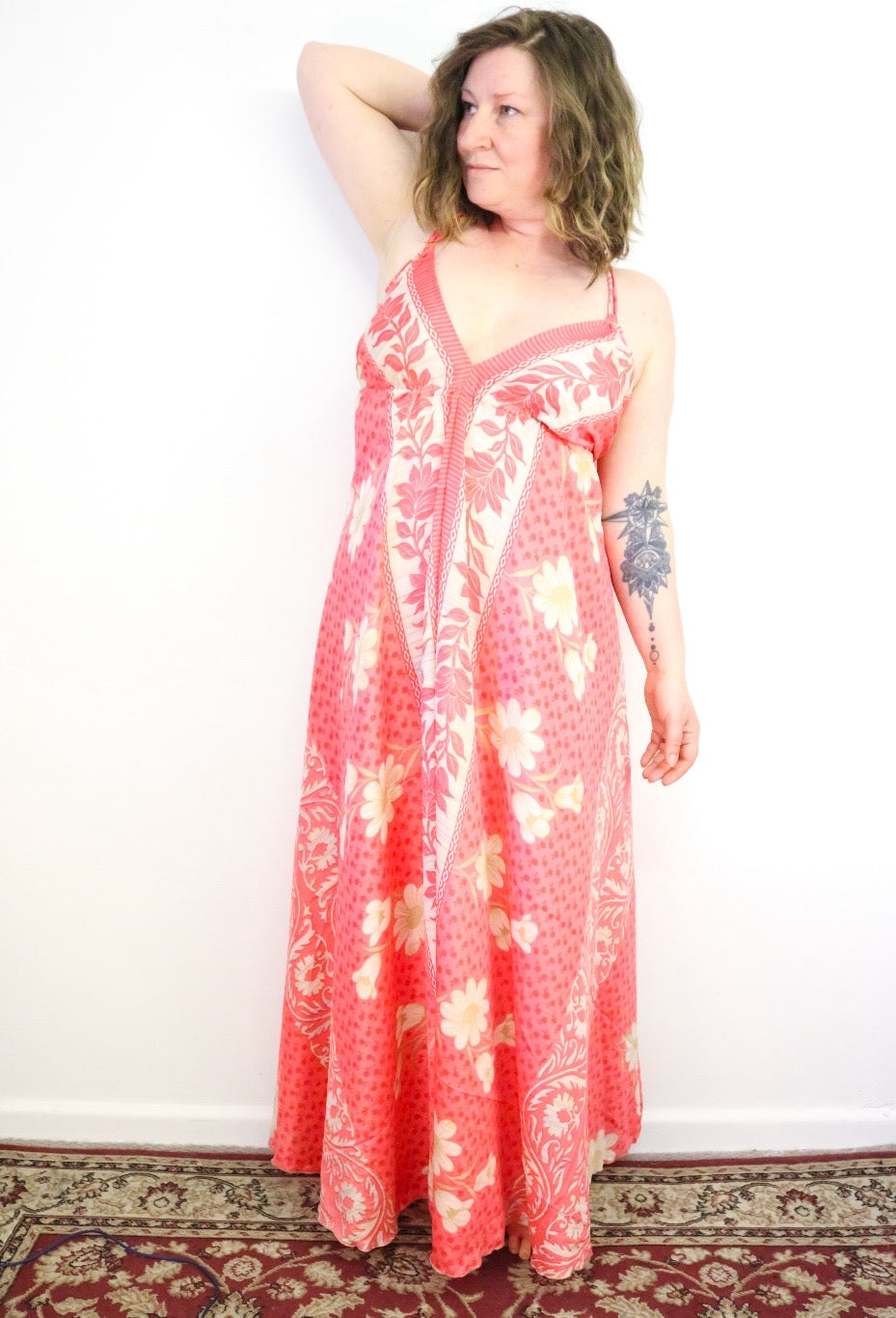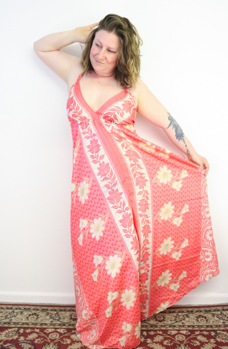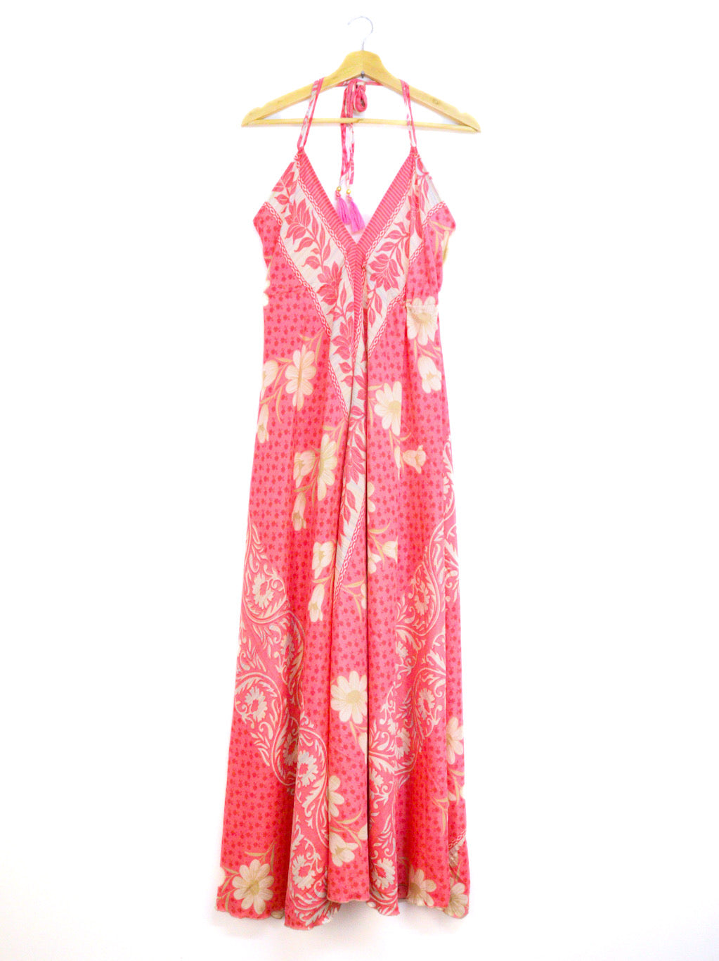 Beautifully crafted from recycled sari fabric, this long flowing boho-maxi dress features adjustable ties at the neck and back, allowing for multiple ways to tie it for a customizable fit. Elevate your style while staying environmentally conscious.