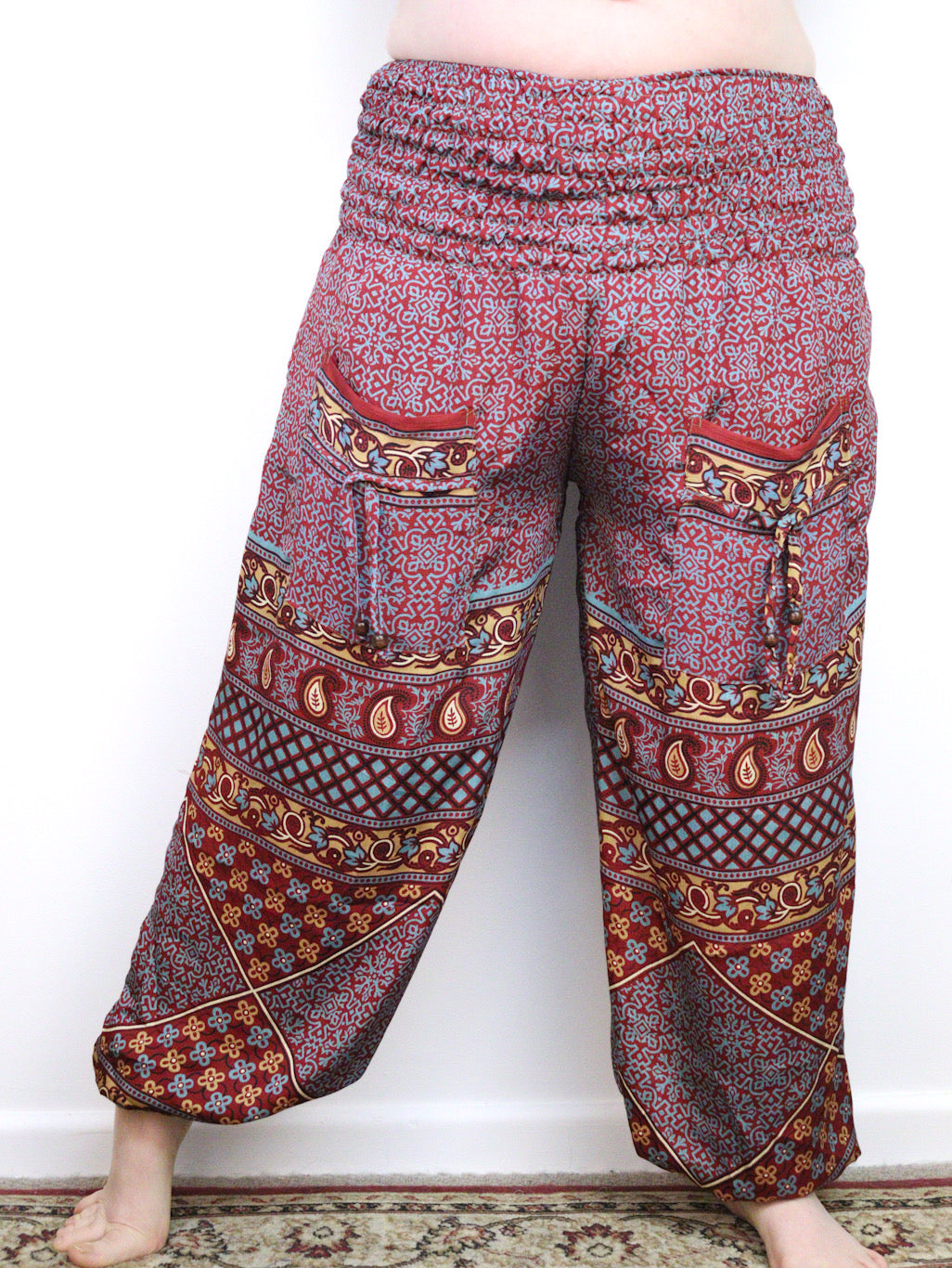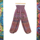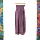 These recycled sari fabric trousers are unisex and elasticated around a wide band at the top making them incredibly comfortable (even on pregnant bellies!).
