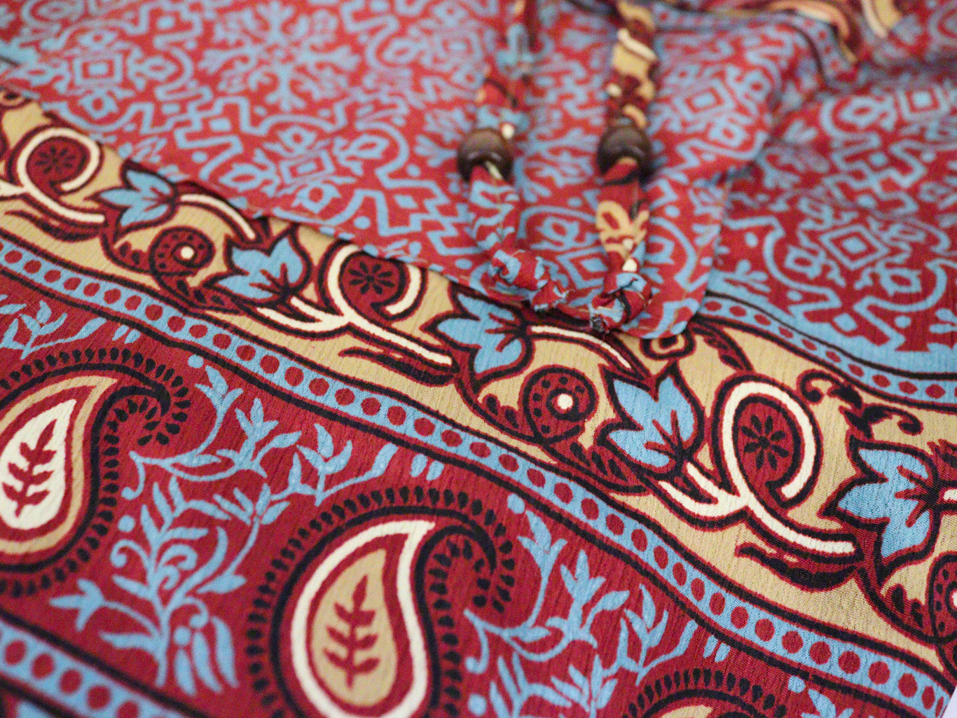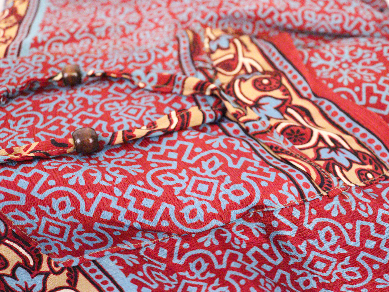 There's two pockets on the front with tie cord and wooden bead details.